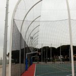 Montagem de postes e rede de 9 m de altura. Postes brancos e rede preta.