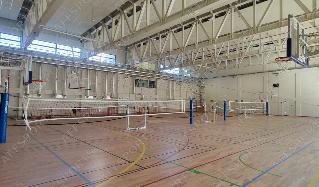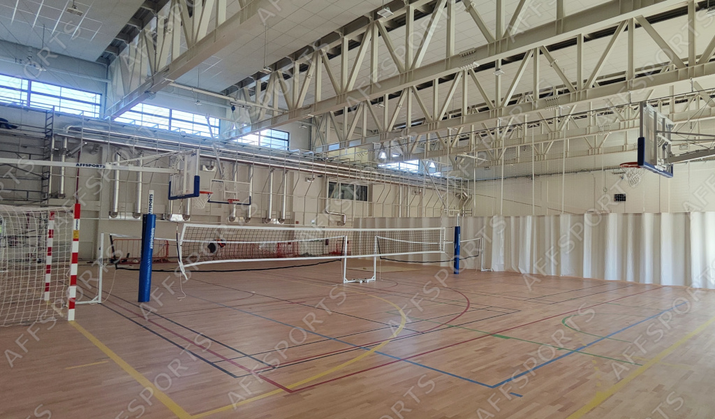 Fornecimento e montagem de Balizas, Tabelas de Basketball, Postes de Voleibol, Placard eletrónico, Cortina Separadora, Espelho Ballet, Barras Ballet.