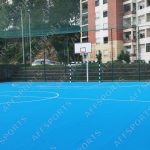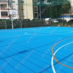 Fornecimento e aplicação de piso (Resina sintética) “In Situ” com marcação de linhas de futsal e basket, instalação de equipamentos desportivos.