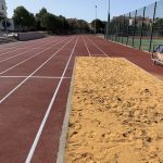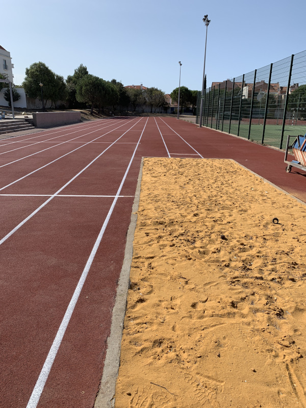 pista de atletismo com caixa de areia, com marcação ode linhas;